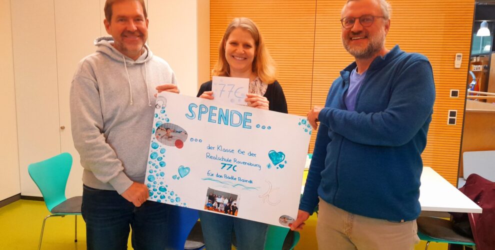 Die Klasse 6e der Realschule Ravensburg sammelte im Laufe des letzten Schuljahres ihre Pfandflaschen. Immer wieder wurde das Pfand in Bares umgetauscht und ein Teil