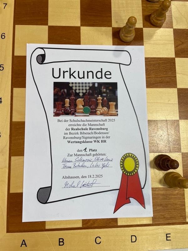 Am 18. Februar nahmen vier Schüler der Realschule Ravensburg an der Schulschachmeisterschaft im Bezirk Biberach/Bodensee/Ravensburg/Sigmaringen teil. Zur Meisterschaft waren fünf Mannschaften mit jeweils vier Spielern nach Altshausen in die Leopoldschule gereist. Sie spielten in vier Runden jeweils 20 Minuten gegeneinander. Die Mannschaft der Realschule Ravensburg holte den Sieg und hat sich somit für die Schulschachmeisterschaft Baden-Württemberg qualifiziert. Die Gewinner sind Leiter bzw. Teilnehmer der Schach-AG an der Realschule Ravensburg: Oliver Krenz, Kenan Selimovic, Batuhan Tosun und Lukas Gehr! Wir sind sehr stolz und gratulieren herzlich zum Sieg!