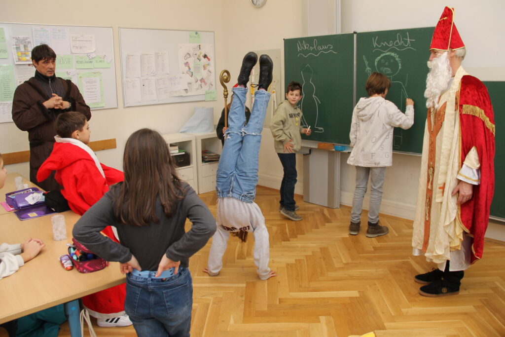 Dabei kam es zu lustigen Begegnungen, denn die beiden sind für allerlei Schabernack zu haben. Die Schüler durften nach vorne kommen und Nikolaus las aus seinem großen Buch vor. Nachdem jeder Schüler Lob oder Tadel bekommen hatte, gab es immer einen Schoko-Nikolaus als Geschenk. Zum Schluss folgte die mittlerweile schon berühmte Showeinlage.