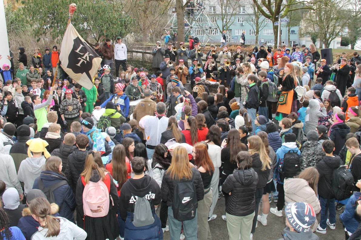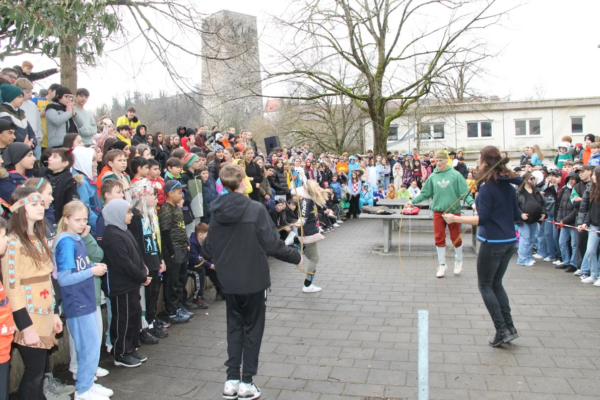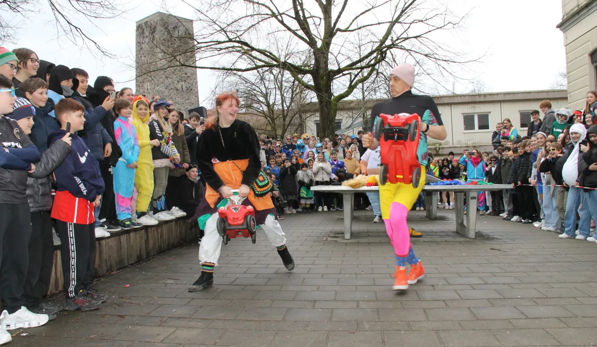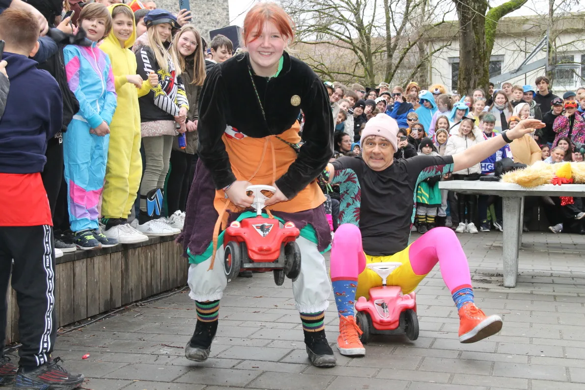 Pünktlich zum Beginn der Fasnetsferien wurden die Schülerinnen und Schüler der Realschule Ravensburg durch eine Abordnung der „Schwarzen Veri“ befreit. Zunächst jedoch musste der Schulschlüssel im Spiel „Schlag‘ die Lehrer“ erobert werden. Dazu traten Schüler und Lehrer gegeneinander an. Die Teilnehmer mussten ihr Können im Jonglieren, Seilhüpfen, Eierlauf und dem schon legendären Bobby-Car Rennen unter Beweis stellen. Nachdem diese Aufgaben erfolgreich gemeistert waren, gab es jedoch kein Halten mehr und die Schülersprecher konnten den Schulschlüssel in Empfang nehmen. Einen tollen Abschluss fand die Befreiung mit dem Auftritt der Lumpenkapelle Taldorf. Wir wünschen allen Schülerinnen und Schülern schöne Ferien!