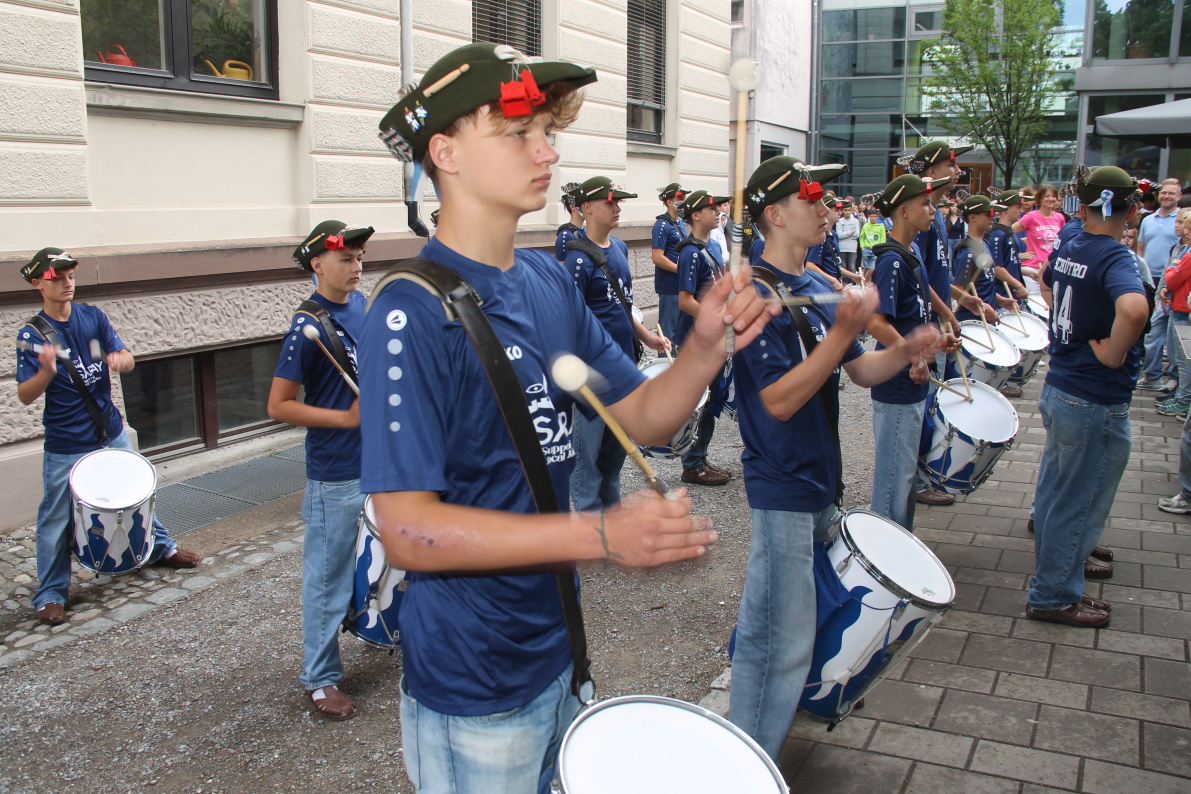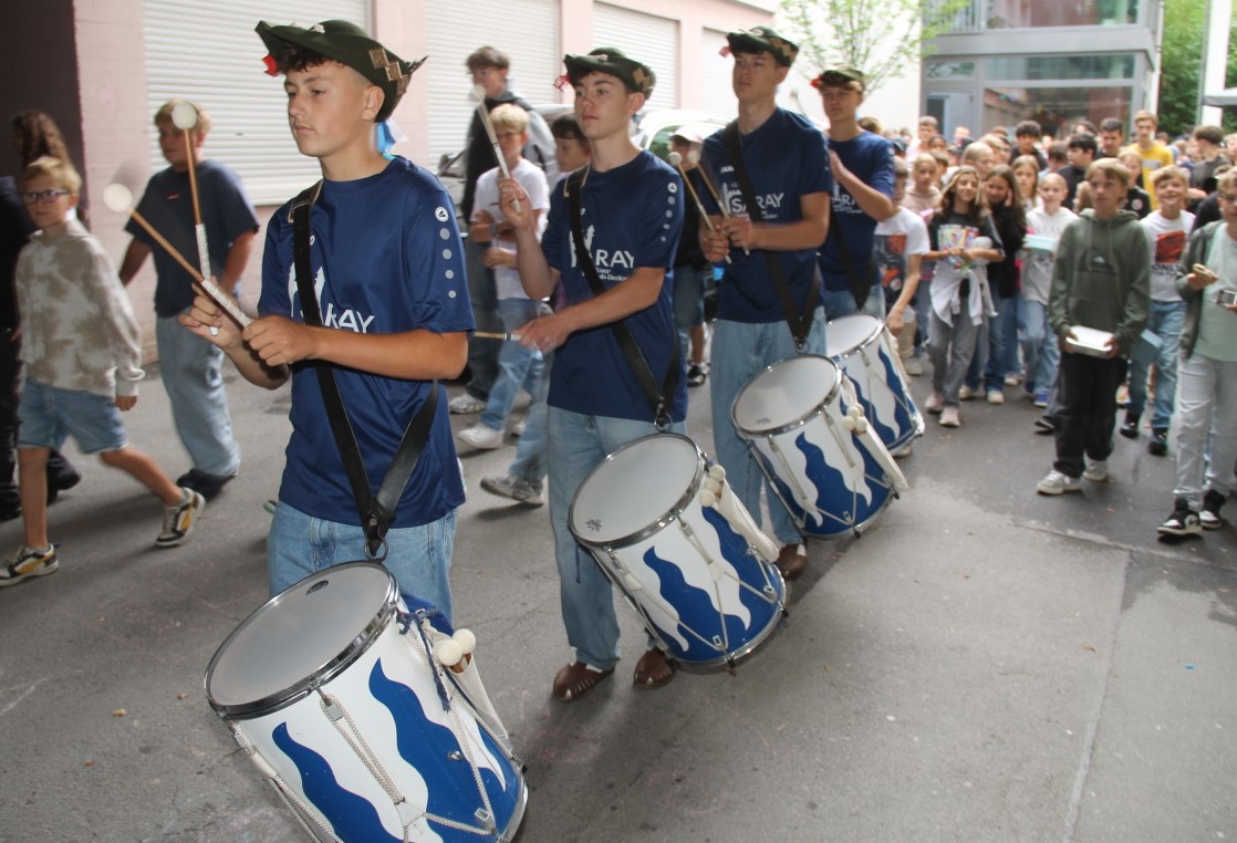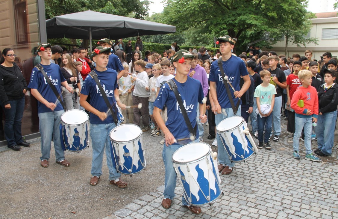 Am Donnerstag, den 24. Juli, kurz vor Beginn des Rutenfestes, gaben die Schützentrommler eine Kostprobe ihres Könnens auf dem Schulhof der Realschule Ravensburg. Umringt von Schülerinnen und Schülern hatten sie die ungeteilte Aufmerksamkeit ihres Publikums. Hier einige Bilder des Auftritts: