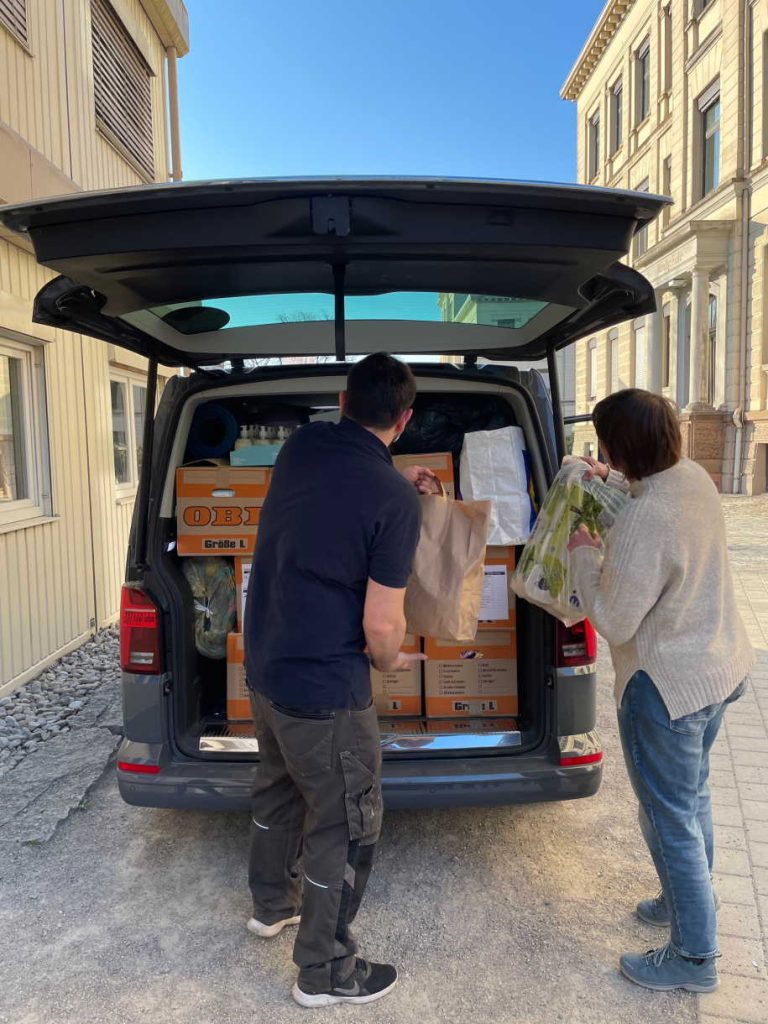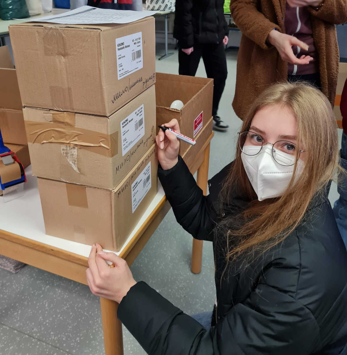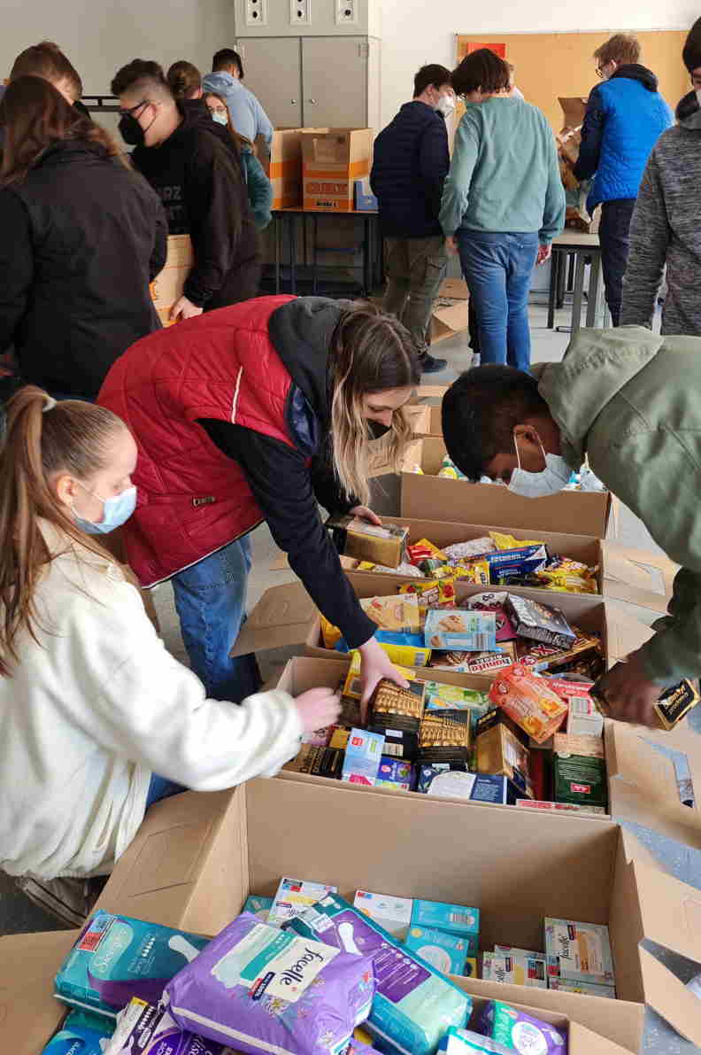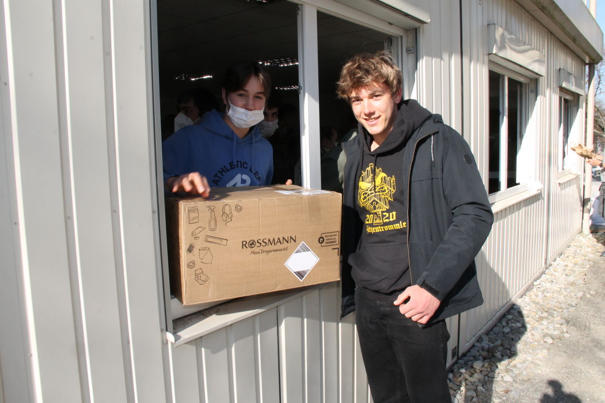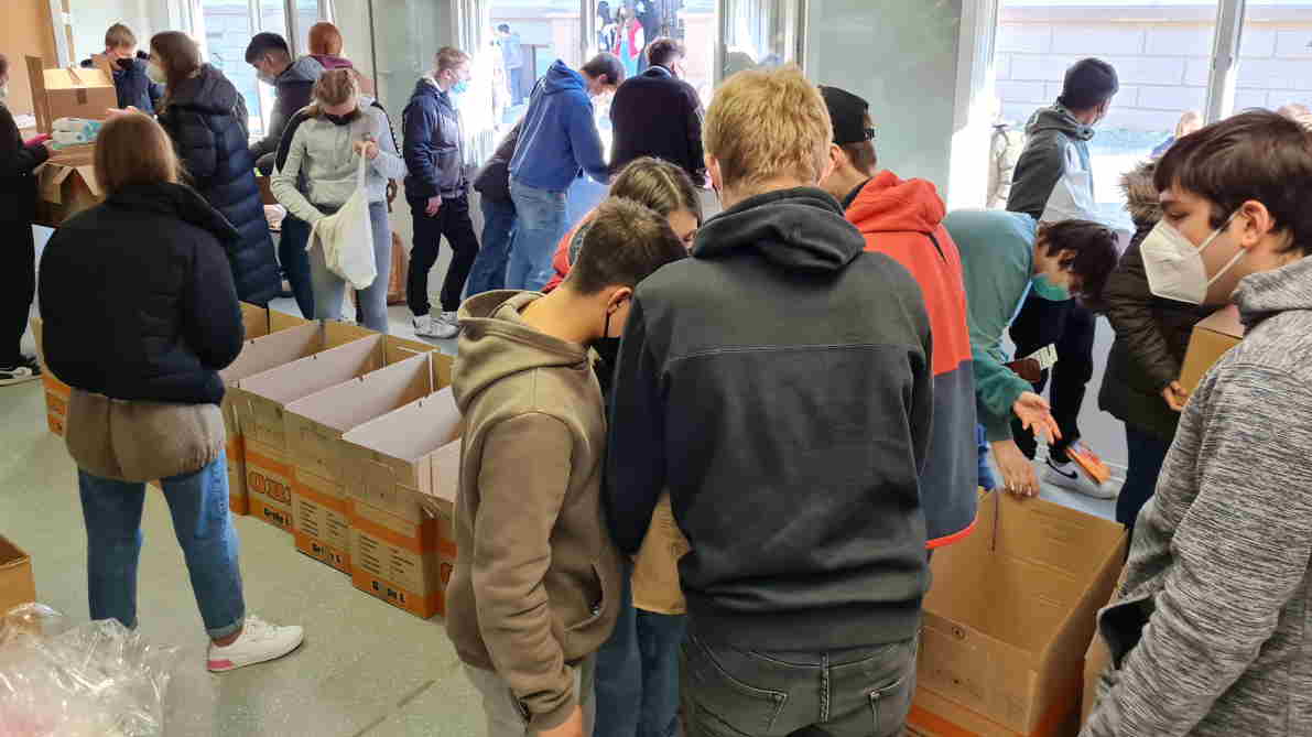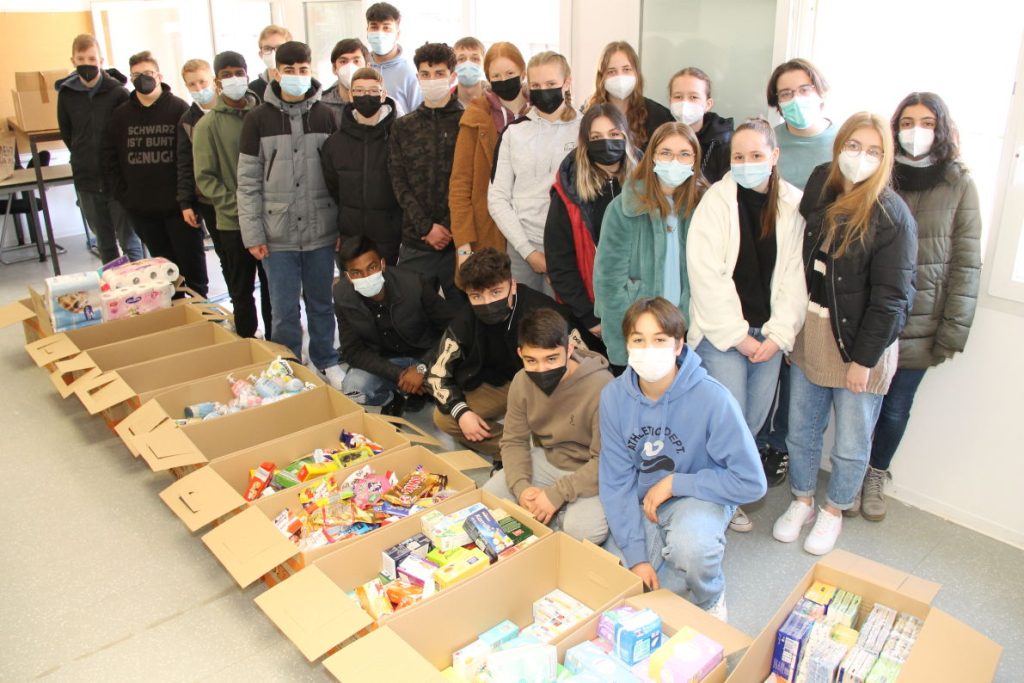 In der großen Pause hatten die Schülerinnen und Schüler sowie die Lehrerinnen und Lehrer Gelegenheit, Sachspenden in Form von Hygieneartikeln und Nahrungsmitteln abzugeben. Die Hilfsbereitschaft war so groß, dass nach nur einem Vormittag ein ganzer VW-Bus beladen werden konnte.